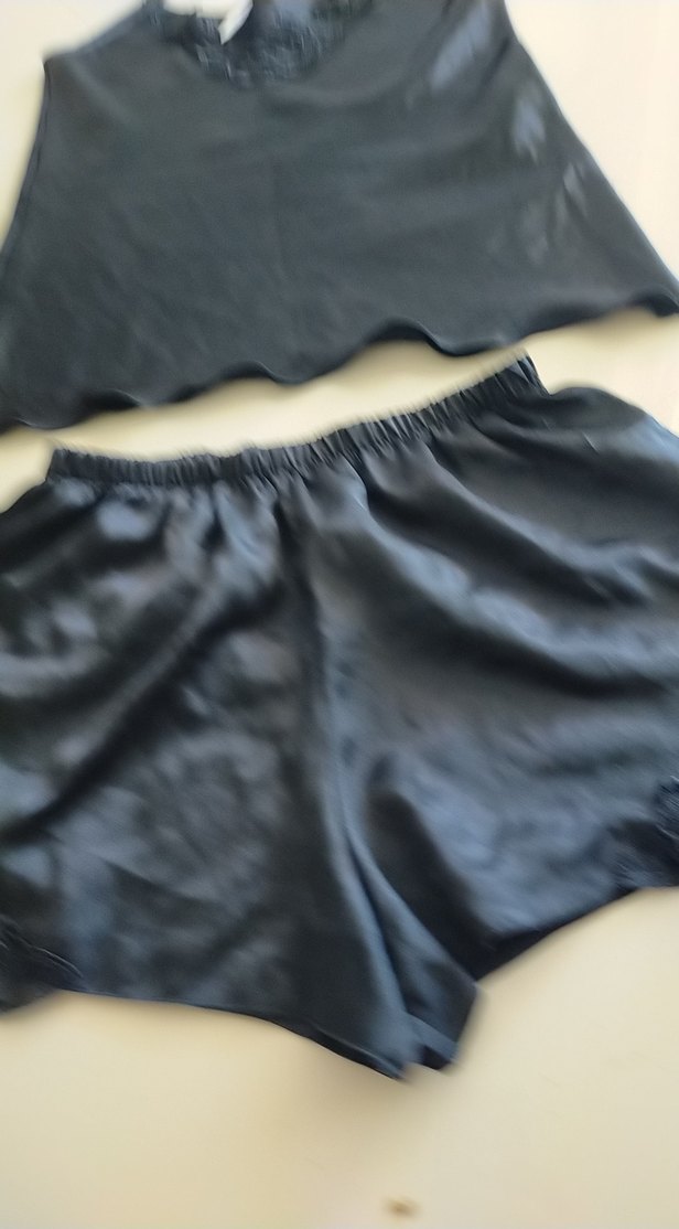 Saten görünümlü, bol kesim siyah hamile mini şortlar, fırfırlı detaylarla günlük kullanıma uygun minimal goth tarzda.