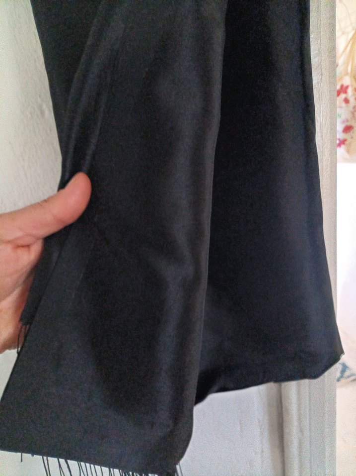 Saten görünümlü, drapeli siyah hamile eteği. Midi boy ve vücuda oturan kesimiyle minimalist goth ofis tarzına uygundur.