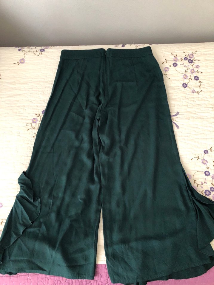 Uzun, salaş kesimli, saten görünümlü, drapeli koyu yeşil kadın pantolon, romantik buluşmalar için uygundur. ön fermuar kısmı dikilmeli onun harici sorunu yok ütülü gönderilicek