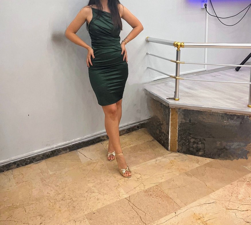 Parlak haki yılan desenli, straplez yaka ve ince askılı, drapeli mini elbise. Romantik akşamlar için ideal. 1 kez giyildi ✨