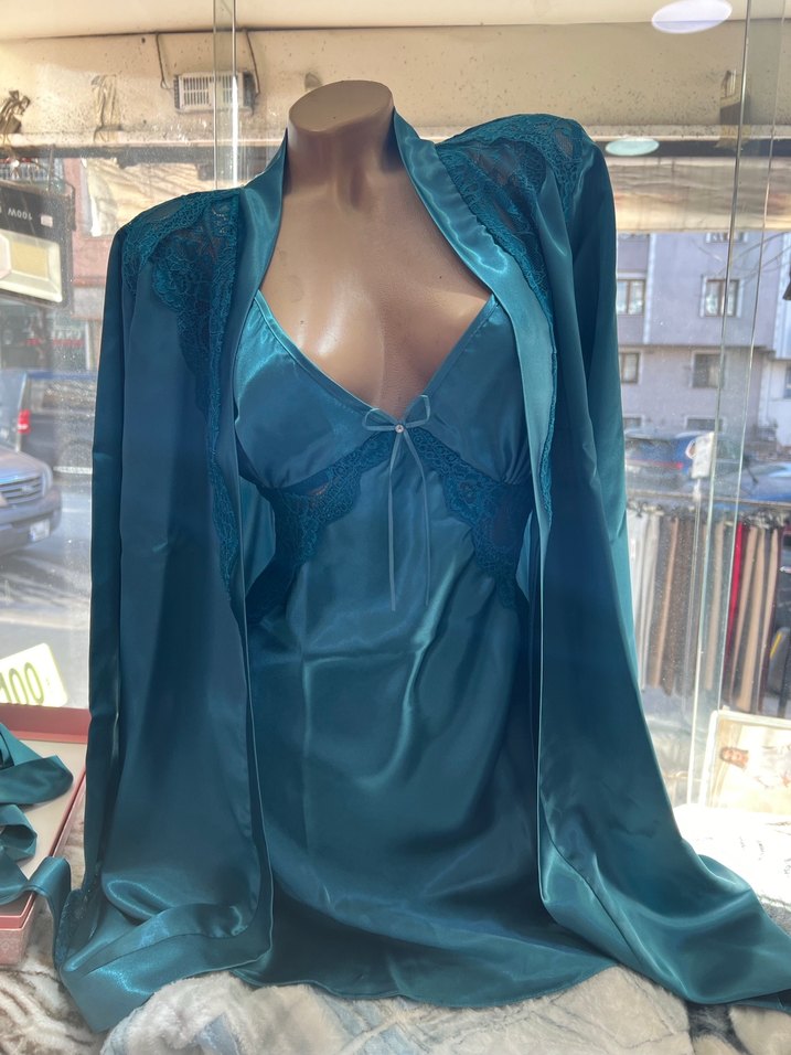 İnce askılı, dantel detaylı uzun turkuaz saten gecelik ve uyumlu sabahlık. Parlak ve vücuda oturan kumaşıyla bohem ve rahat bir tarz sunar. Bedeni S. Sayfada diğer renkleri de mevcut