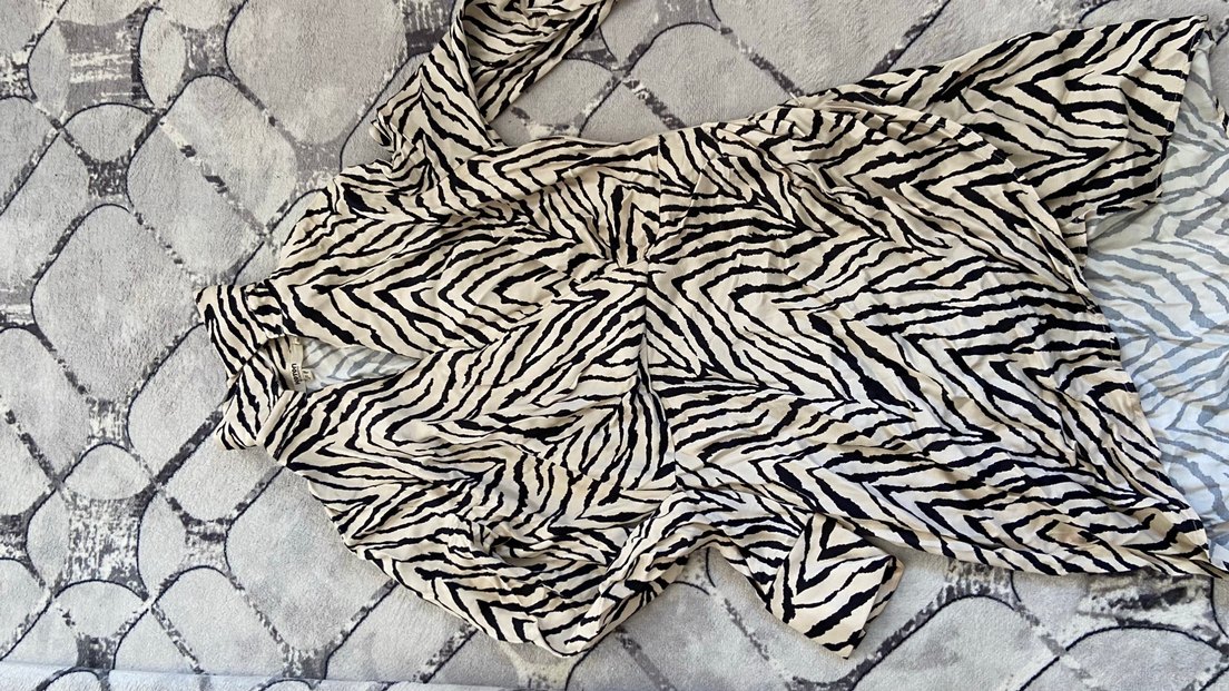 Yumuşak sentetik kumaştan, gri renkli ve pilili, bohem zebra desenli kadın elbise