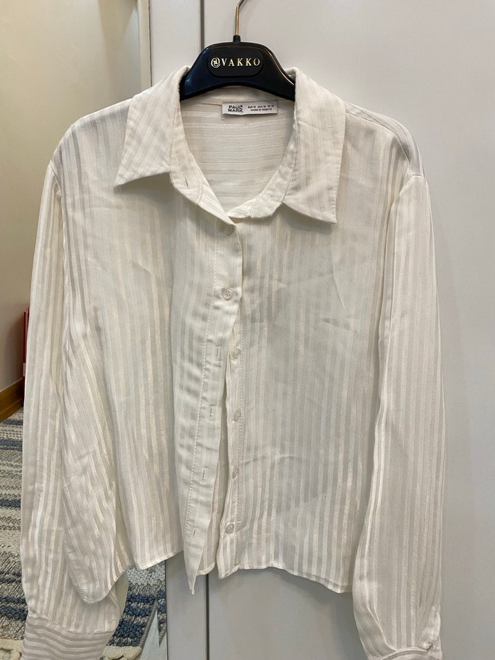 Düğmeli, uzun kollu beyaz satenimsi kadın gömlek. Yakalı, gevşek kesim ve normal boyda. Ofis için uygun, çok şık ince çizgili dokulu S-M uyumlu