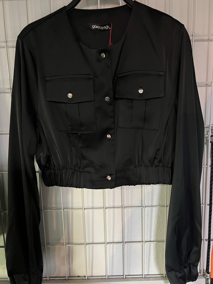 Uzun kollu, düğmeli ve yakalı siyah mini ceket. İnce ve parlak kumaştan
