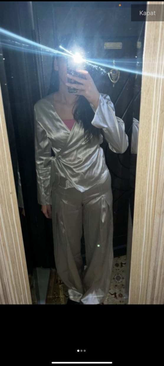 Gri saten kumaştan, salaş kesimli, drapeli V yakalı kadın takım elbisesi. Uzun kollu ve midi boyda, parti ve avant-garde sokak stili için uygun. ✨ 3LÜ TAKIM