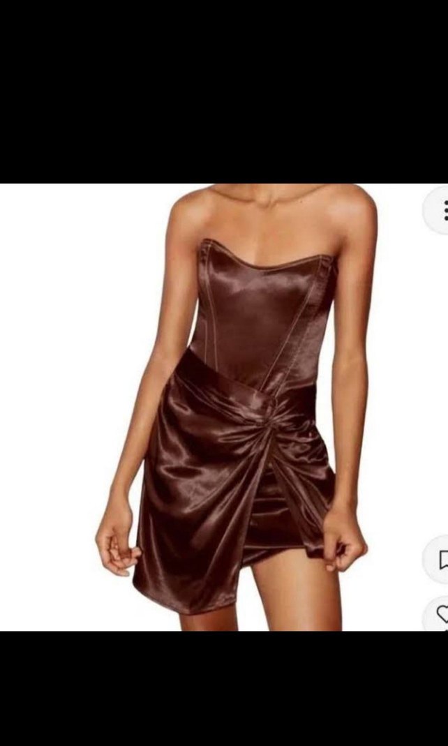Kahverengi saten kumaştan, straplez ve drapeli, vücuda oturan mini elbise, romantik gece için uygun. ✨