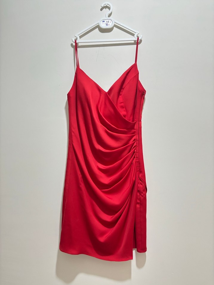Saten kırmızı, vücuda oturan mini elbise, ip askılı ve ipeksi kumaştan, gösterişli partiler için ideal. ✨