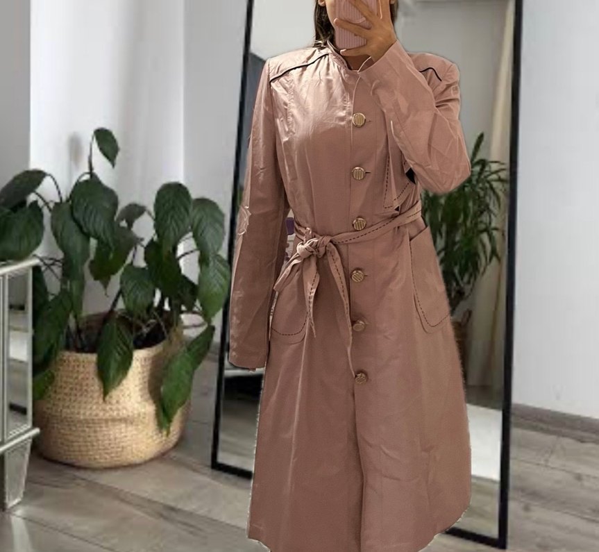 Bej midi uzunlukta, notalı yaka ve düğmeli ön kısmıyla kuşaklı kadın kisa pardesü Yumuşak sentetik kumaştan, uzun kollu ve pastel tonlarda, günlük rahat stil için ideal. Defolmesi yok cok sik 38/40bedenede olur