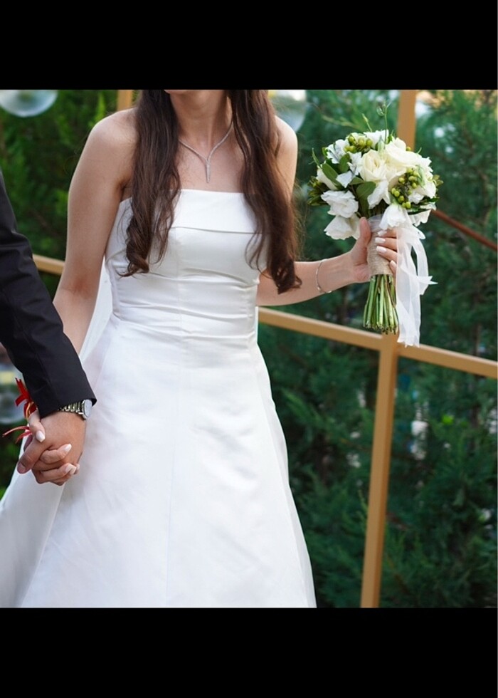 Kadiköyde bir gelinlikçide kişiye özel olarak diktirildi. Sade ve sik bir model tercih ettim. Gelinlik 60 kg 170 kg beden üzerinde dikilmistir. Sirt kisminda ipleri vardir ayarlanabilirdir. Esnetilip sikilabilir. incili duvak mevcut. Yalnizca bir kez dügünde giyildi ve kuru temizlede temizlendi su an tertemiz herhangi bir deforme yok.