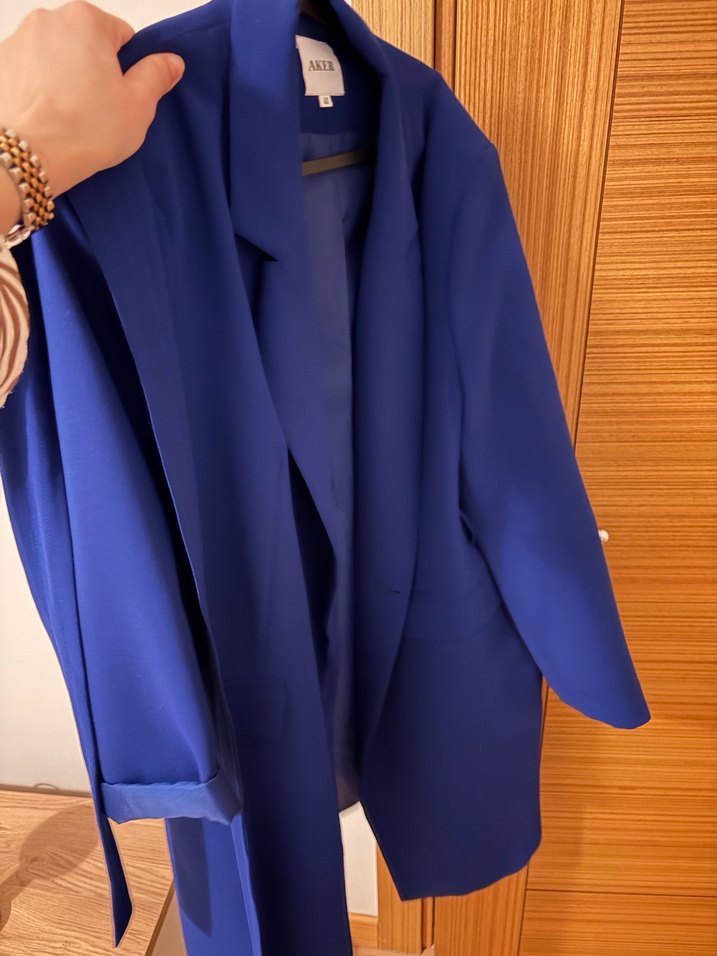 Uzun boylu, saten kumaşlı mavi kadın blazer, kemerli ve kesimli yaka detaylıdır. Düzenli kesim, askılı kollu, ofis ve günlük kullanıma uygundur. 36-42 beden uyumludur. Çok az giyildi.