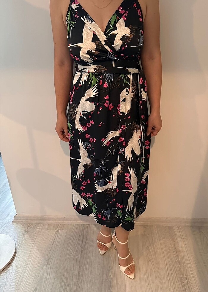 Saten kuş desenli Elbise