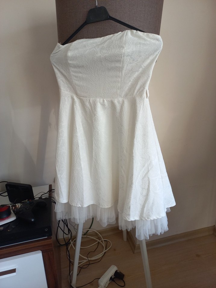 Beyaz straplez midi gelinlik, bol kesim ve bohem tarzda. Kolsuz, hafif ve ferah kumaşla şık bir düğün görünümü sağlar. kendinden desenli. isterseniz özel bir günde, isterseniz düğününüzde giyebilirsiniz. Kabarık duruyor. Uzunluğu dizde. altta etekleri Tül olan astarı var. Çok romantik bir elbise.