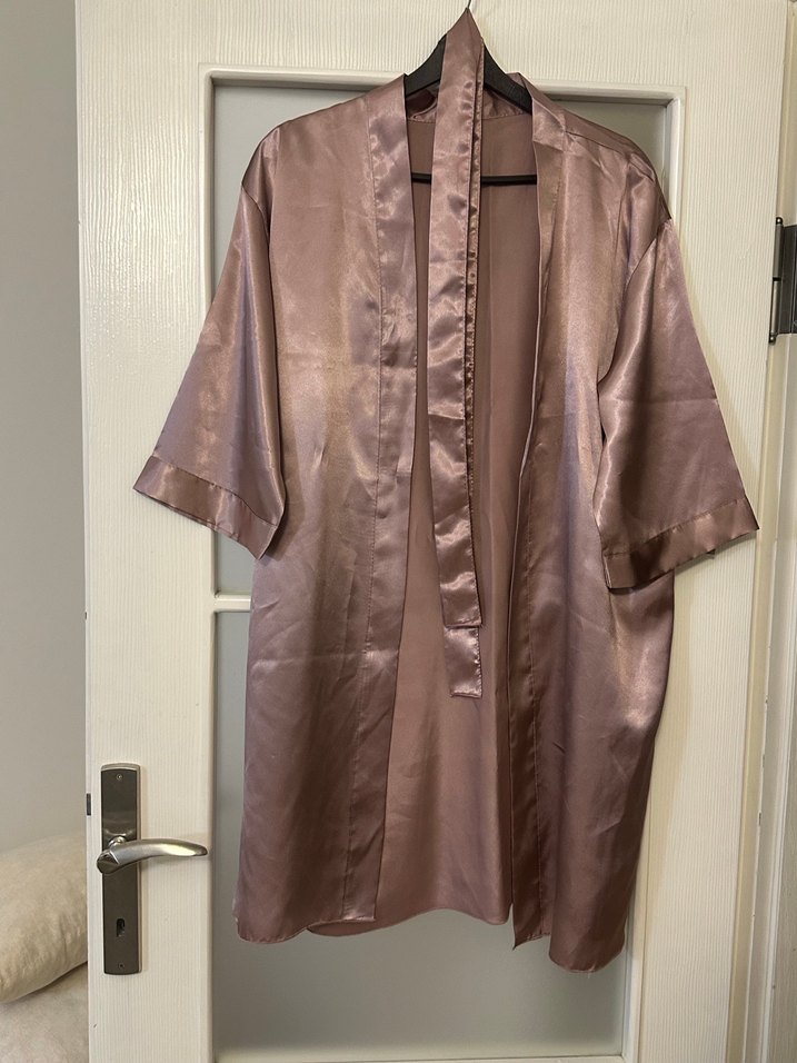 Parlak bej saten kumaştan, kısa kollu ve bol kesimli midi uzunlukta minimalist bohem tarzda kadın sabahlık. Düz ve yumuşak dokulu. Sadece bir kez otel de bride giyinildi marka temsilidir