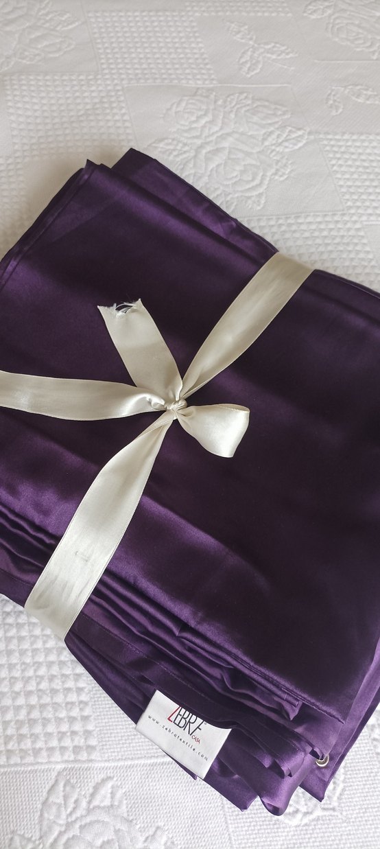 Zebra marka mor saten nevresim takımı. 4 yastık kılıfı ( 2 pano+2 düz) , çarşaf ve nevresimden oluşan tam takım sadece bir defa kullanıldı. tertemiz ve defosuzdur.