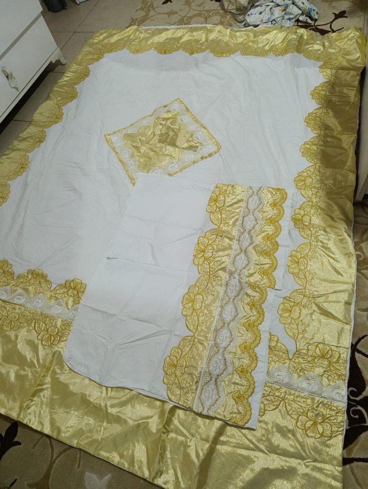 Parlak saten kumaş ve altın renkli ince nakış desenlerine sahip beyaz yatak örtüsü. Uyumu sağlayan yastık kılıfları da dahildir. ️