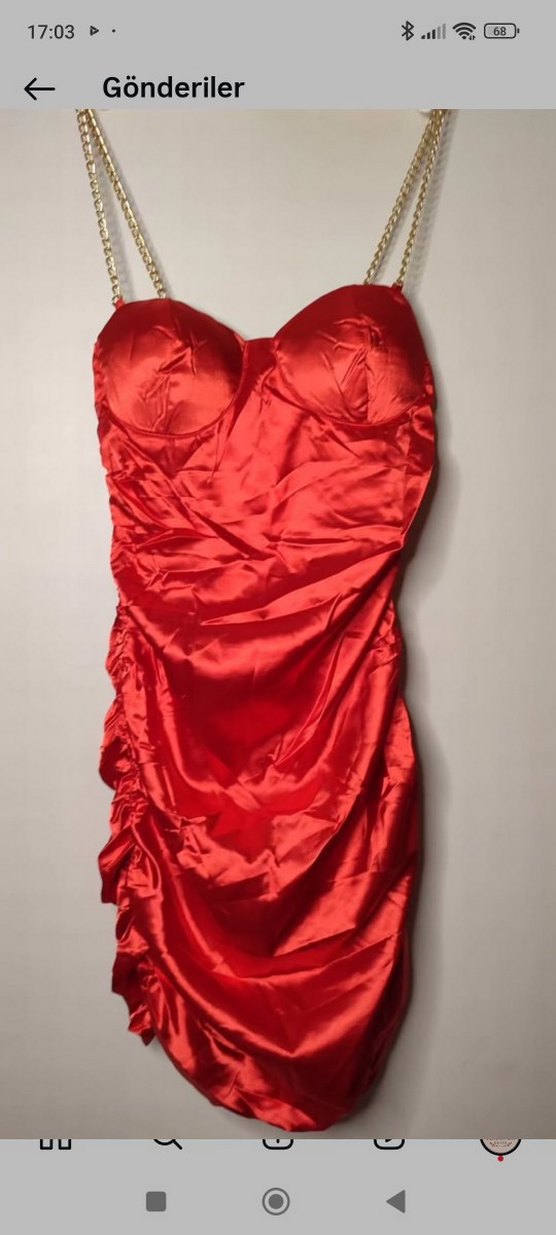 s ve M bedeni mevcut sıfır ürün Parlak kırmızı kumaştan, drapeli ve askılı zincir detaylı, straplez ve vücuda oturan midi abiye elbise, gösterişli partiler için uygundur.
