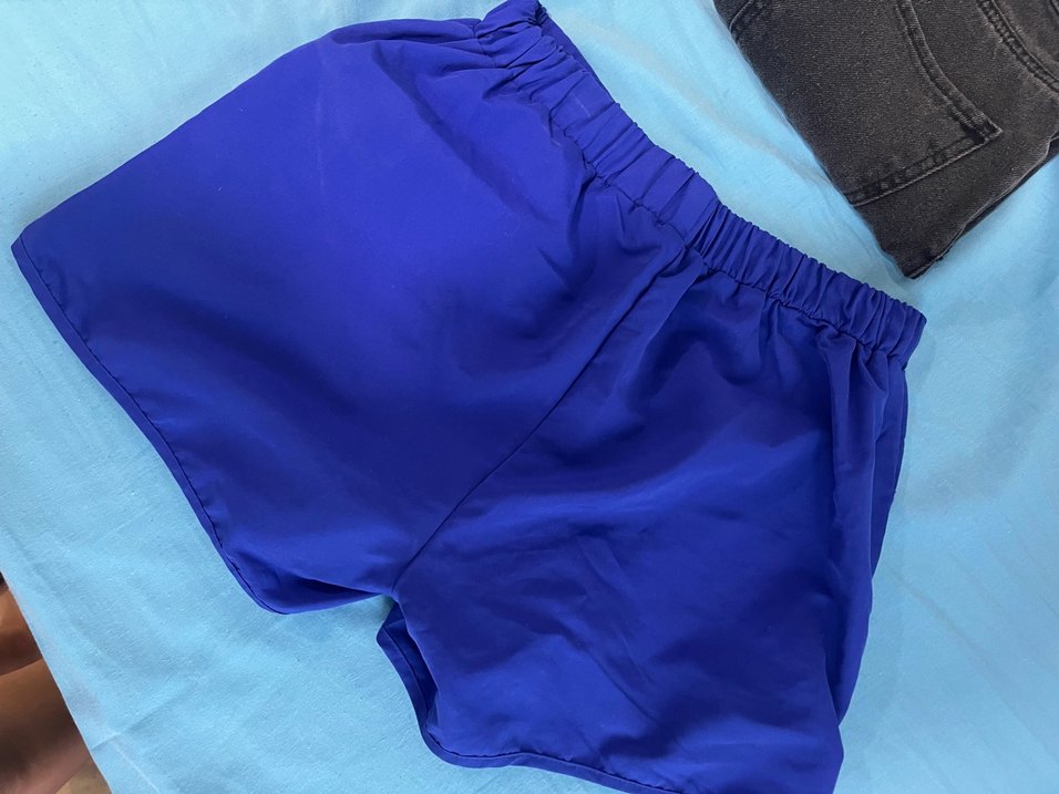 Parlak mavi, saten dokulu, kısa ve dar kesim hamile şortu, rahat sokak stili için uygundur.