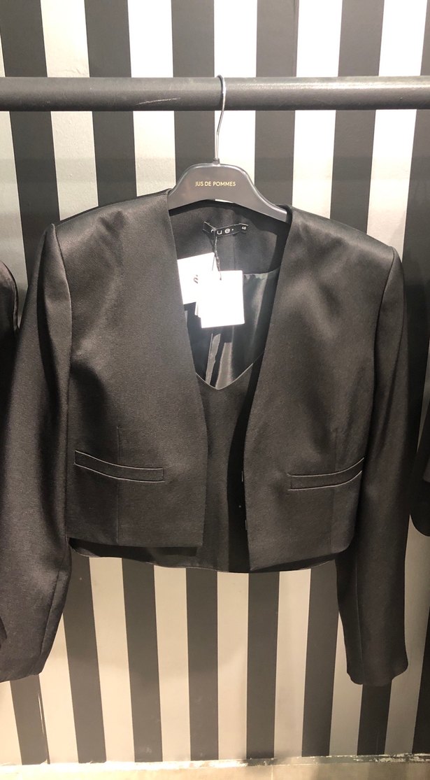 Parlak siyah mini blazer, saten kumaştan, yakası çentikli ve düğmeli. Strappy kollu, ofis için şık ve düzenli kesim.