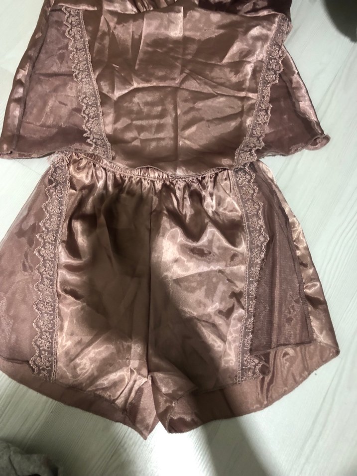Hiç giyilmedi yıkanıp ütülenip gönderilecektir.Parlak saten, dantelli ve askılı üst ile şortlardan oluşan vintage tarzda, vücuda oturan konvansiyonel pijama takımı.Marka temsilidir hatırlamıyorum