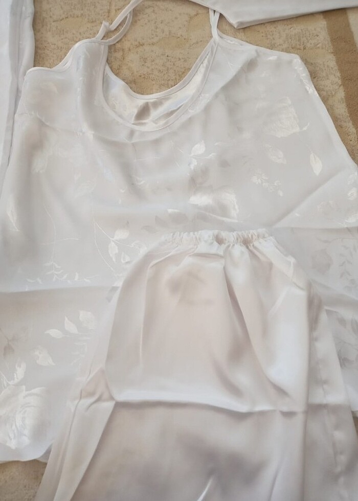 Çayiz için alınmış ve hiç kullanılmamıştır.askılı üst,şort,askılı elbise gibi,uzun kollu üst,uzun alt ve sabahlık olmak üzere 6 parçadır.