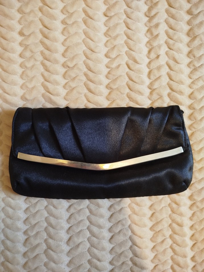 Saten dokulu, pilili ve parlak siyah yüzeye sahip, metal detaylı klasik ve düğün stiline uygun kadın portföy çanta.