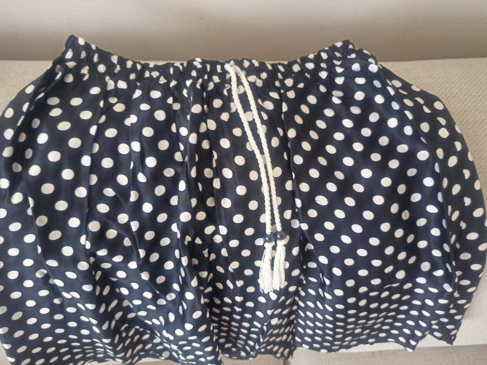 siyah puantiyeli, bol kesim kısa etek. Fırfır detaylı, bohem tarzda, günlük kullanıma uygun.