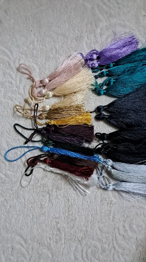 Saten püsküllü, koyu çok renkli saç aksesuarları. Bohem ve retro tarzlara uygun, saçlara şık ve eğlenceli bir dokunuş katar. 26 adet