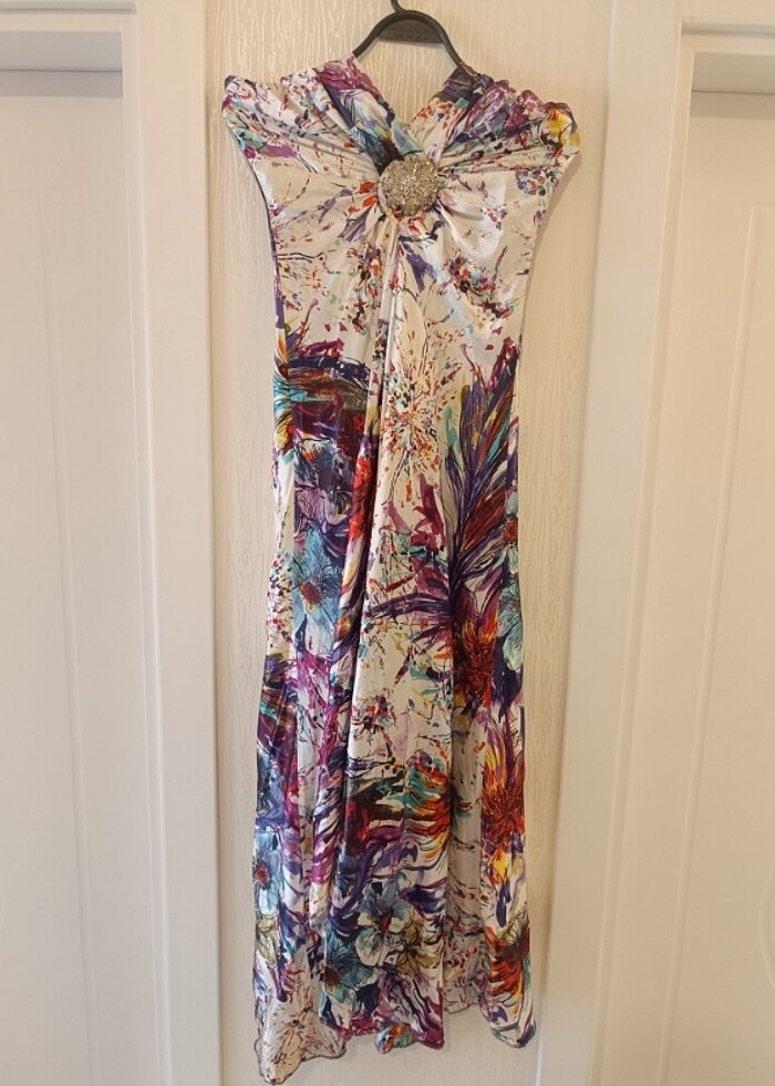 Ürün saten rengarenk boyundan düğmeli şık bir elbisedir herhangi bir deformesi sıkıntısı yoktur