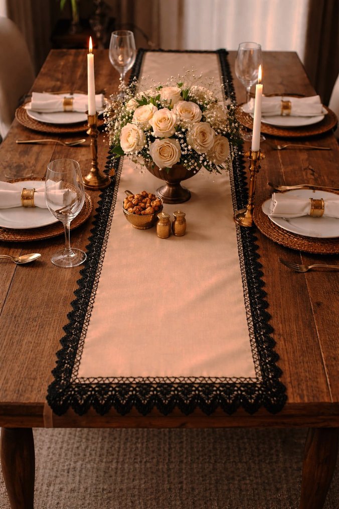 kahverengi renginde dört tarafı siyah dantelli saten runner.. ölçüleri 38*134 cm.dir. yeni üründür.