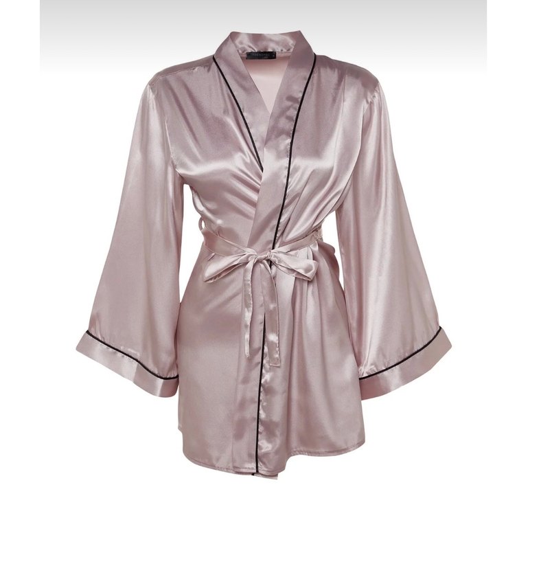 Parlak pembe renkte, bol kesim ve midi boyda kadın sabahlık. Uzun kolları siyah şerit detaylı ve belden bağlamalı, çağdaş Paris tarzında.