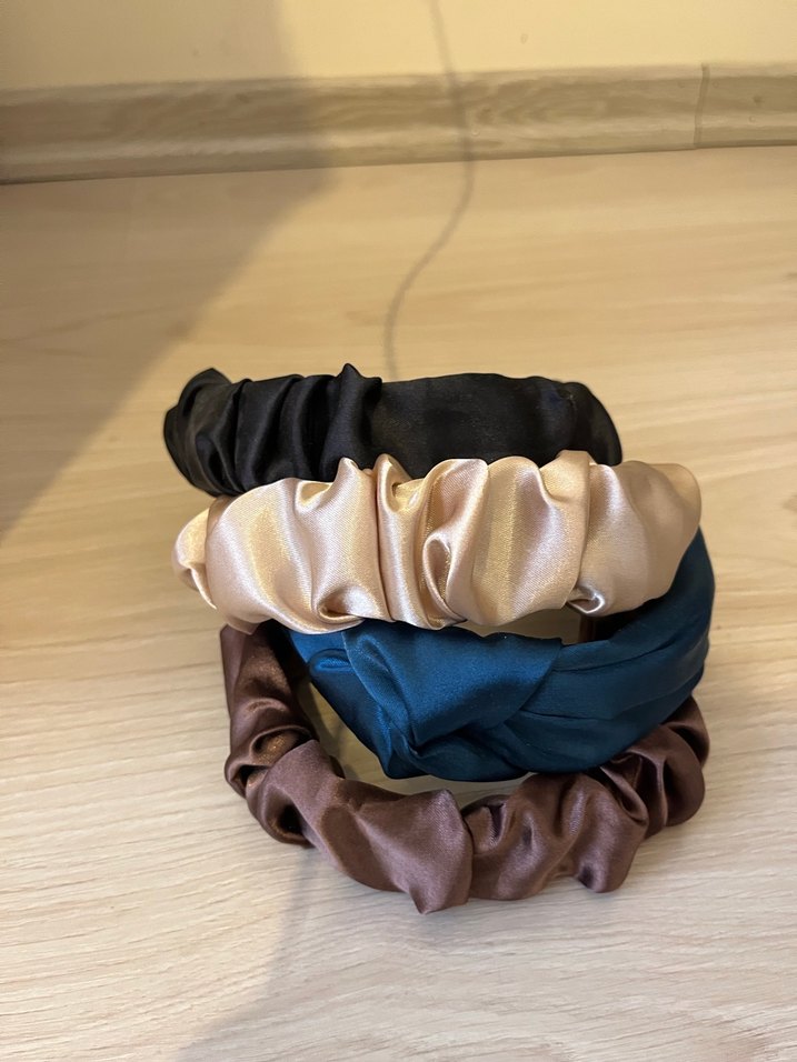 Kahverengi, siyah, bej ve yeşilimsi tonlarda bohem Paris tarzı elastik saten saç tokaları.
