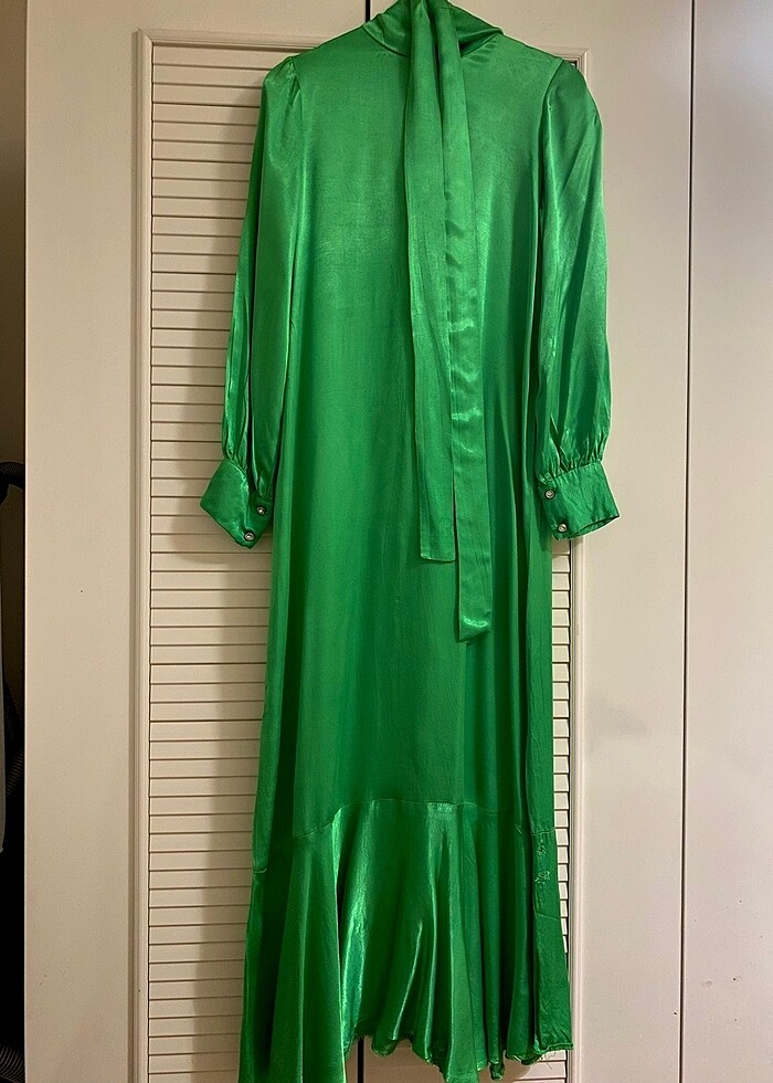 En altında hafif bir yırtığı var onun haricinde hiçbir deformesi yok 1 kez giyildi. Arkası fermuarlı. Seyyar kemeri var fotoğrafta görünüyor. Boynu kapatıyor yakası o yüzden boneyle kullanıma da uygundur S-M uyumludur