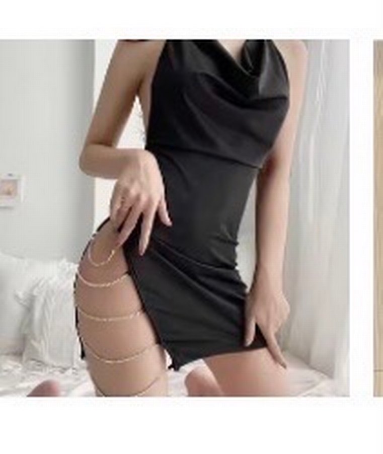 Saten siyah, drapeli ve askılı mini elbise, halter yaka ve vücuda oturan kesimiyle gösterişli parti tarzı sunar.