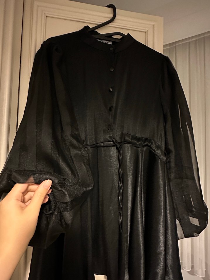 Saten siyah kumaştan, parlak yüzeyli, düğmeli, yüksek yakalı ve uzun kollu, bol kesim tünik. 1 kez giyildi uygun altına bol olmayan etekle de güzel ben etekle giymiştim pantolonlada giyilir.