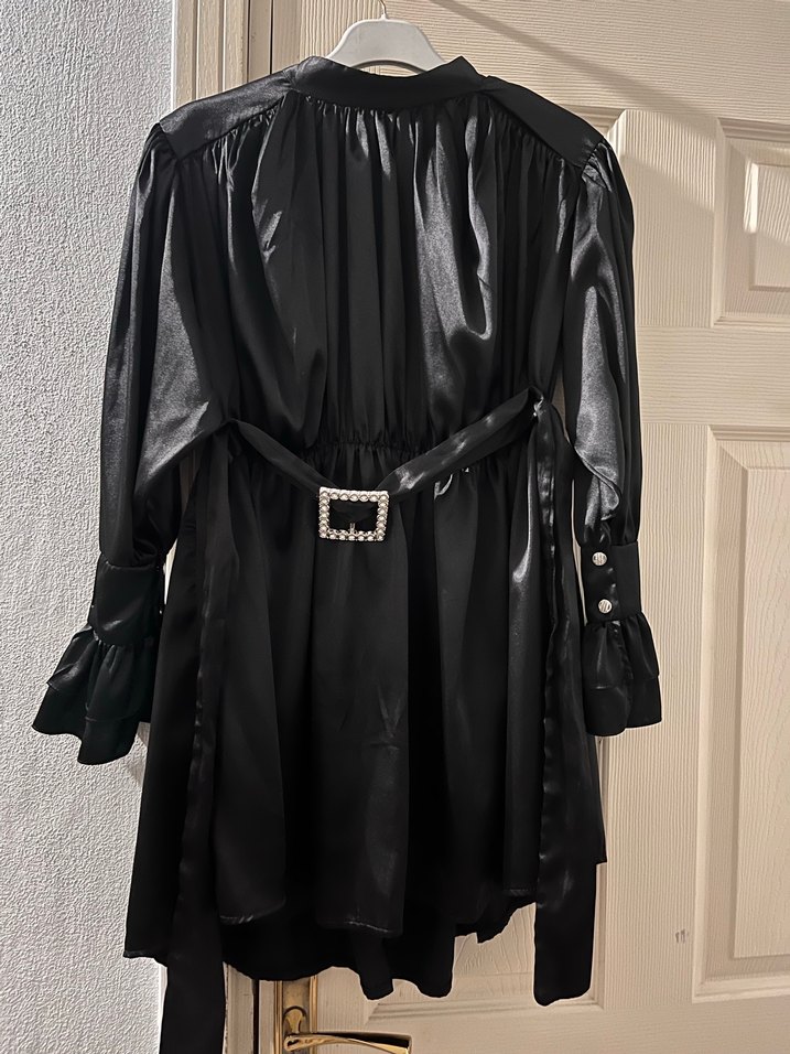 Bu siyah parlak saten görünümlü kumaş, bol kesim Dekoratif tokalı kemeri ve düğmeli manşetleri ile gotik stile uygundur.