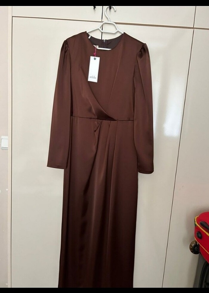 Sadece 2 defa giyildi çok şık ve rahat edebileceğiniz bir elbise koyu kahverengi normalde 40 beden giyiyorum ama bu elbisede 38 oldu 166 boy 65 kilo marka stillefe ben alırken fark etmedim görünmeyecek kadar ufak bir çizgi var kolunda belli olmuyor