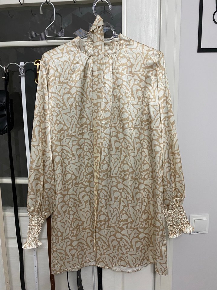 Bej yılan desenli, uzun kollu midi tunik. Yüksek yakalı, pileli, bol kesim ve hafif keten kumaştan yapılmıştır. Bohem Paris tarzını yansıtır. Boyu 84 cm ,iki koltuk arası 52 cm.