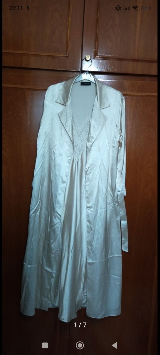 Parlak beyaz kumaştan, uzun ve kolsuz, düzenli kesim kadın sabahlık. Bohem Paris tarzında, desensiz ve şık görünümlü.