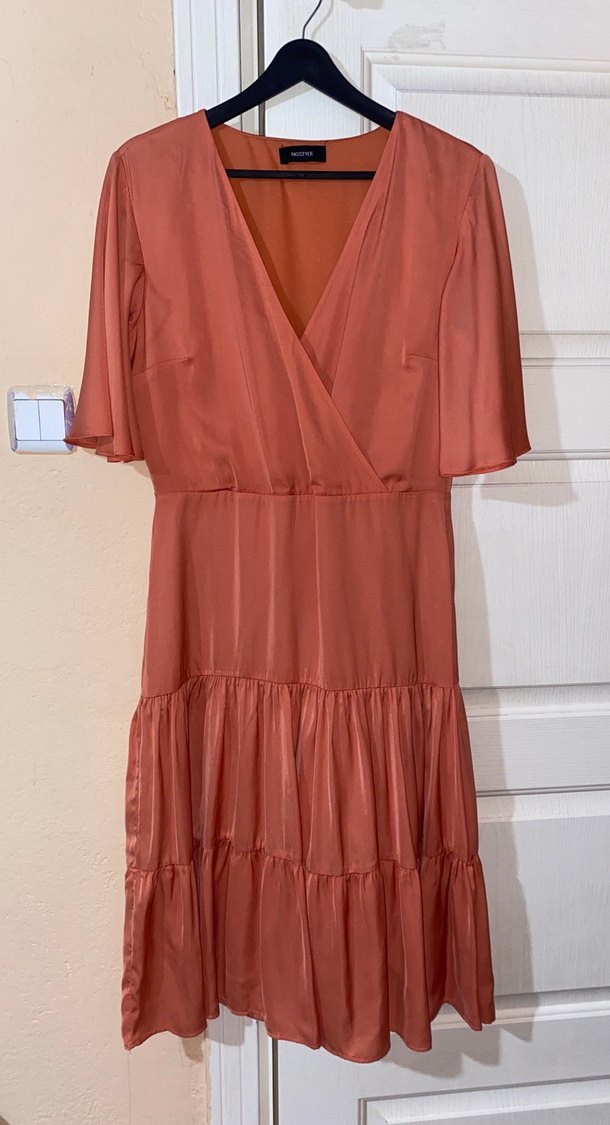 Satenimsi, bol kesim midi elbise, kısa kollu ve V yakalı. Drapeli tasarımı ve parlak bej rengiyle bohem tarzını yansıtıyor, romantik buluşmalar için uygun.