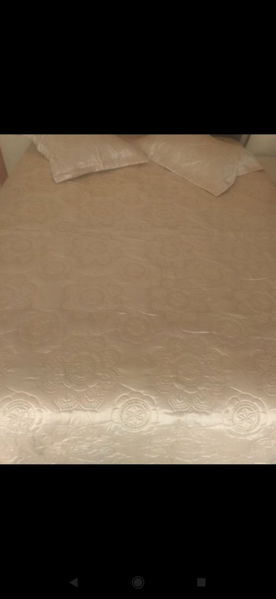 1 kez kullanılmıştır. çiçek desenli pul işlemeli bej rengi çift kişilik saten yatak örtüsü ve 2 yastık kılıfı..ister çeyizlik ister günlük kullanıma uygun ..odanıza temiz ve şık bir görünüm kazandırır ️.
