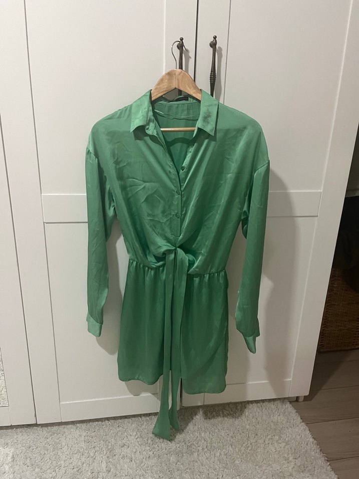 Parlak yeşil renkte, uzun kollu ve bağlamalı beliyle bol kesim mini kadın elbisesi. Paris sokak modasına uygun.