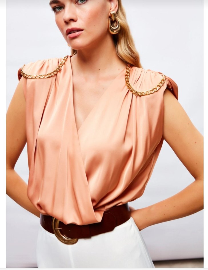 Zincir detaylı, V yaka, kolsuz pudra bluz. İpek gibi kumaştan, kısa ve bol kesimli, modern ve şık bir ofis görünümü ve geceiçin uygundur.yeni etiketli sateen markadır.#şıkbluz#bayanbluz#sateen#yenietiketli# ✨