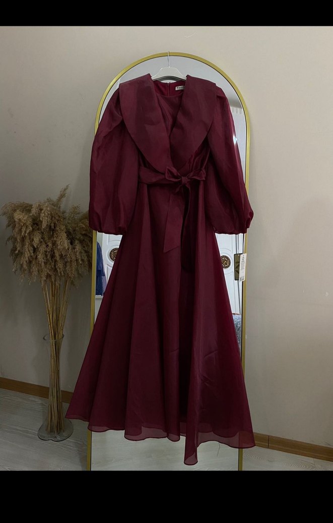 Kadınlar için bordo uzun, drapeli ve notlu yaka detaylı saten elbise. Uzun kollu, bol kesim ve modern klasik tarzıyla düğünler için ideal. Paris şıklığını yansıtıyor. 38_40 bedene uyumludur