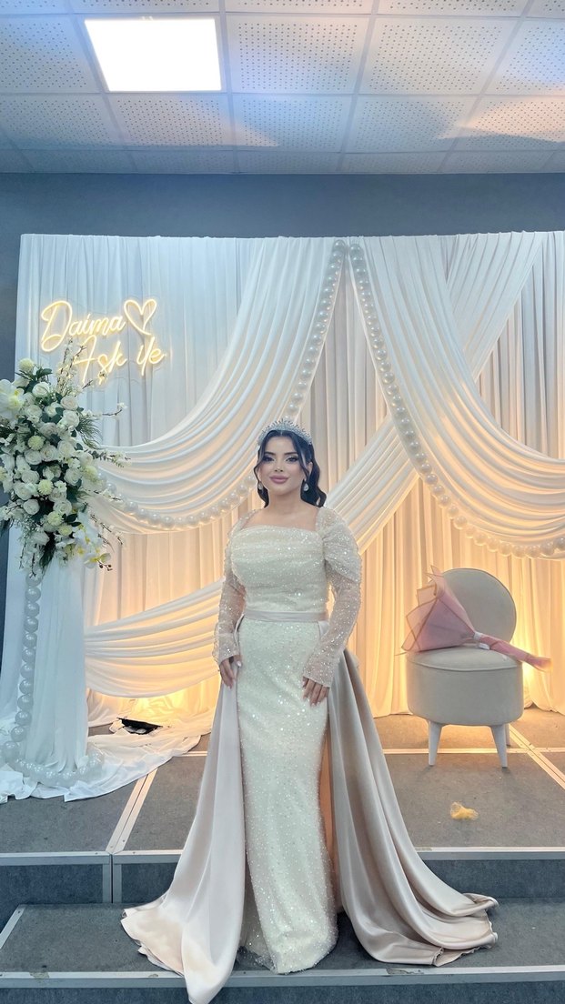 Uzun kollu, straplez yakalı krem nişan elbisesi , modern klasik ve göz alıcı şıklığı bir arada sunar. ✨