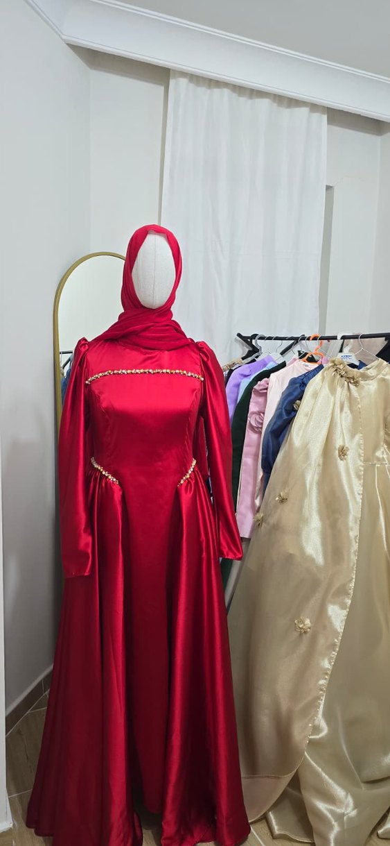 SATILIK tesettür Kırmızı İşlemeli Uzun Kollu Abiye Elbise