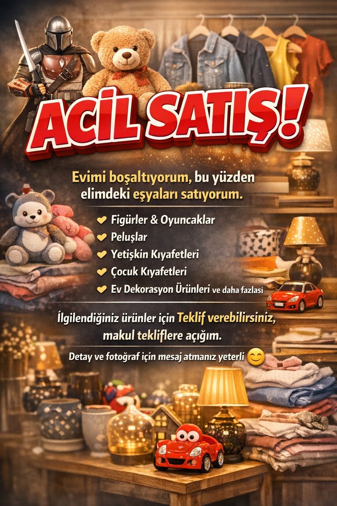 ACİL SATIŞ İLANİ ❗ Evimi boşaltıyorum, bu yüzden elimdeki eşyaları satıyorum. Çok çeşitli ürünler mevcut: Figürler & oyuncaklar Peluşlar Yetişkin kıyafetleri Çocuk kıyafetleri Ev dekorasyon ürünleri ve daha fazlası İlgilendiğiniz ürünler için teklif verebilirsiniz, makul tekliflere açığım.