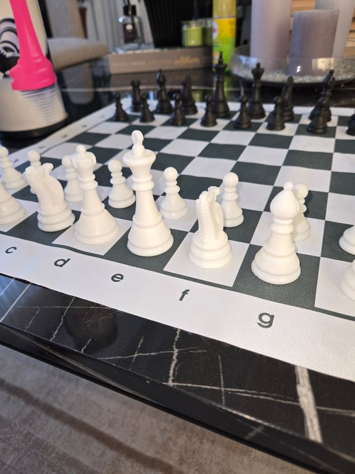Klasik tasarımlı beyaz ve siyah taşlardan oluşan satranç seti. Üzerinde koordinat işaretleri bulunan kareli oyun örtüsü ile♟️
