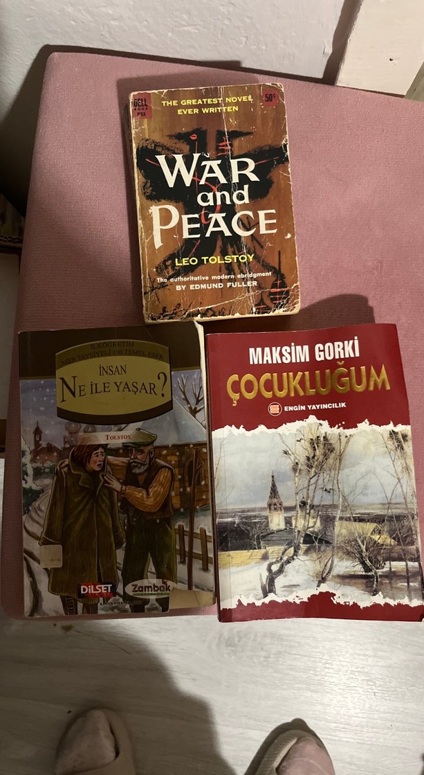 Leo Tolstoy'nun Savaş ve Barış(inglizce), Maksim Gorki'nin Çocukluğum ve Tolstoy'un (türkçe) İnsan Ne İle Yaşar? kitapları bir arada. Klasik eserler.