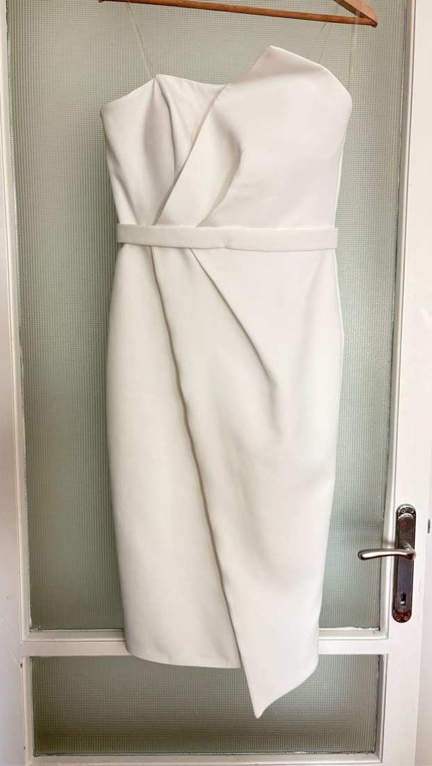 Beyaz renkli, straplez ve kolsuz uzun mini gelinlik. Minimalist ve çağdaş tasarıma sahip, ofis ortamına uygun düzenli kesim.