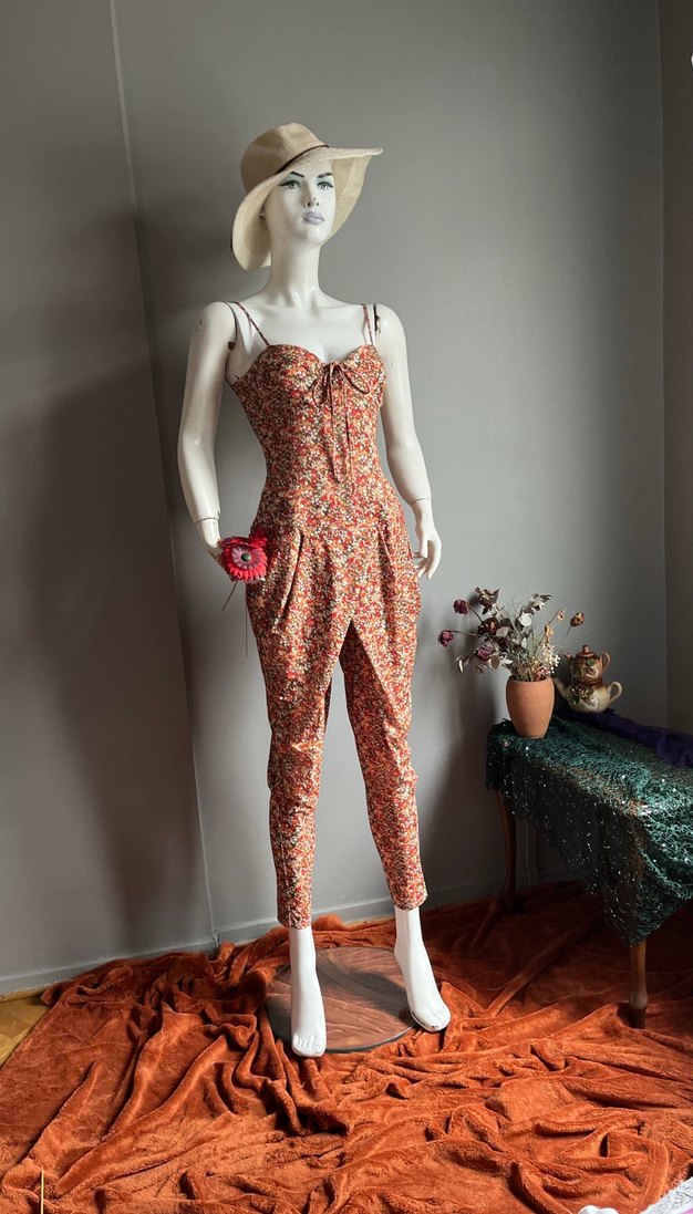 Ayarlanabilir askı ,iki yandan cepli bel kendinden kemer detaylı oturtmalı Minik Çiçeklerle bezenmiş Jarse kumaştan yıka yıka giy misali ofiste ,denizde ,günlük her ortama yakışacak sıfır ,etiketli tulum